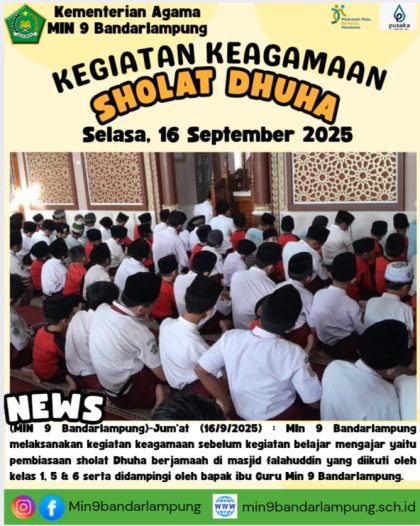 Agama | Pendidikan | Sekolah | • 18 September 2025 • Sholat Dhuha Berjamaah di MIN 9 Bandarlampung Membentuk Karakter Religius Sejak Usia Dini dutacendikia.id, Bandar Lampung – MIN 9 Bandarlampung terus menunjukkan komitmennya dalam membentuk karakter religius peserta didik...