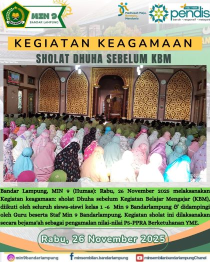 Agama | Pendidikan | Sekolah | • 27 November 2025 • Penguatan Iman dan Akhlak: MIN 9 Bandarlampung Laksanakan Sholat Dhuha Berjamaah dutacendikia.id, Bandar Lampung – Suasana pagi di MIN 9 Bandarlampung, Rabu (26/11/2025), diawali dengan pelaksanaan...