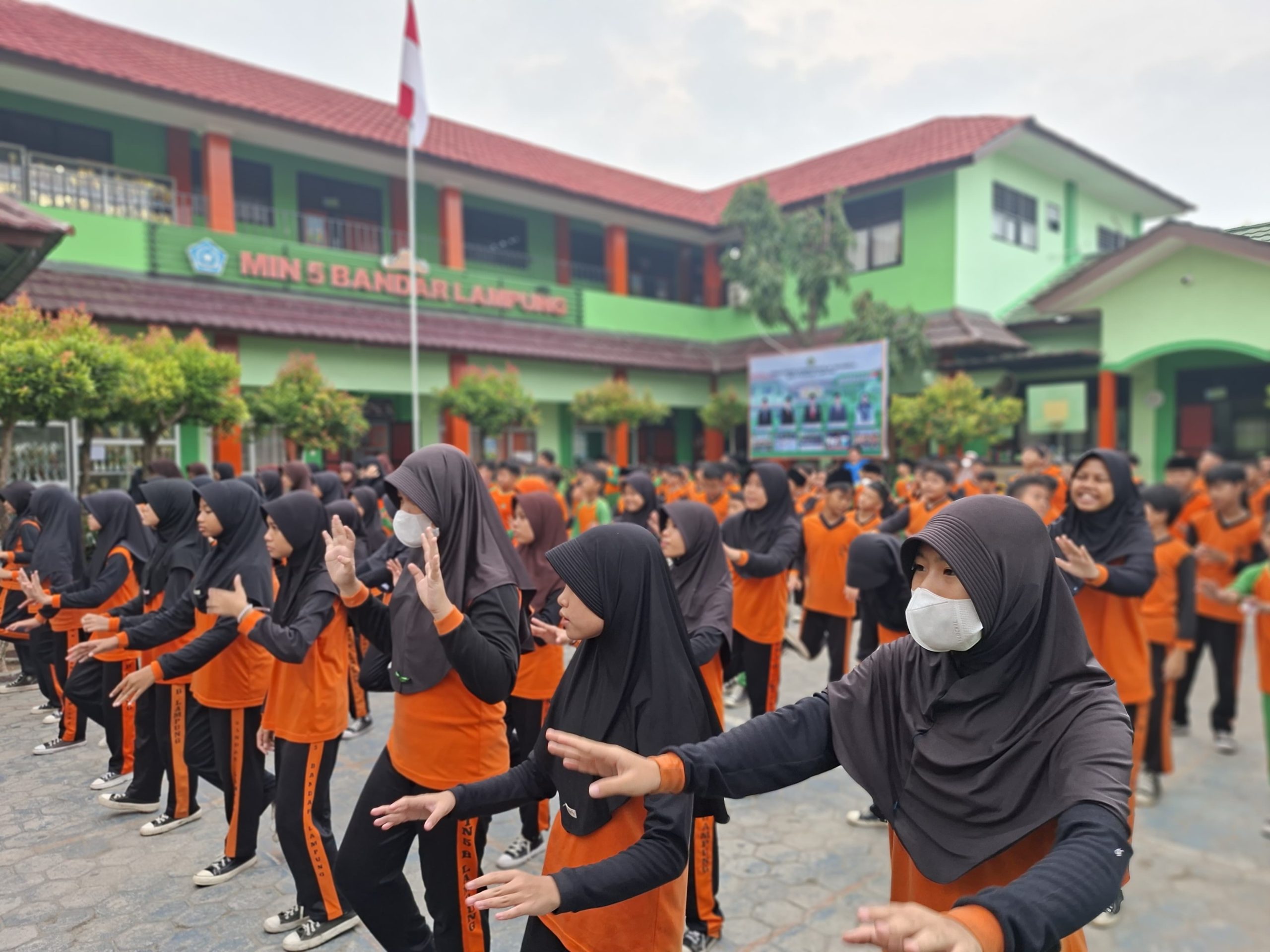 Suasana senam bersama di halaman MIN 5 Bandar Lampung yang diikuti siswa dengan penuh semangat.
