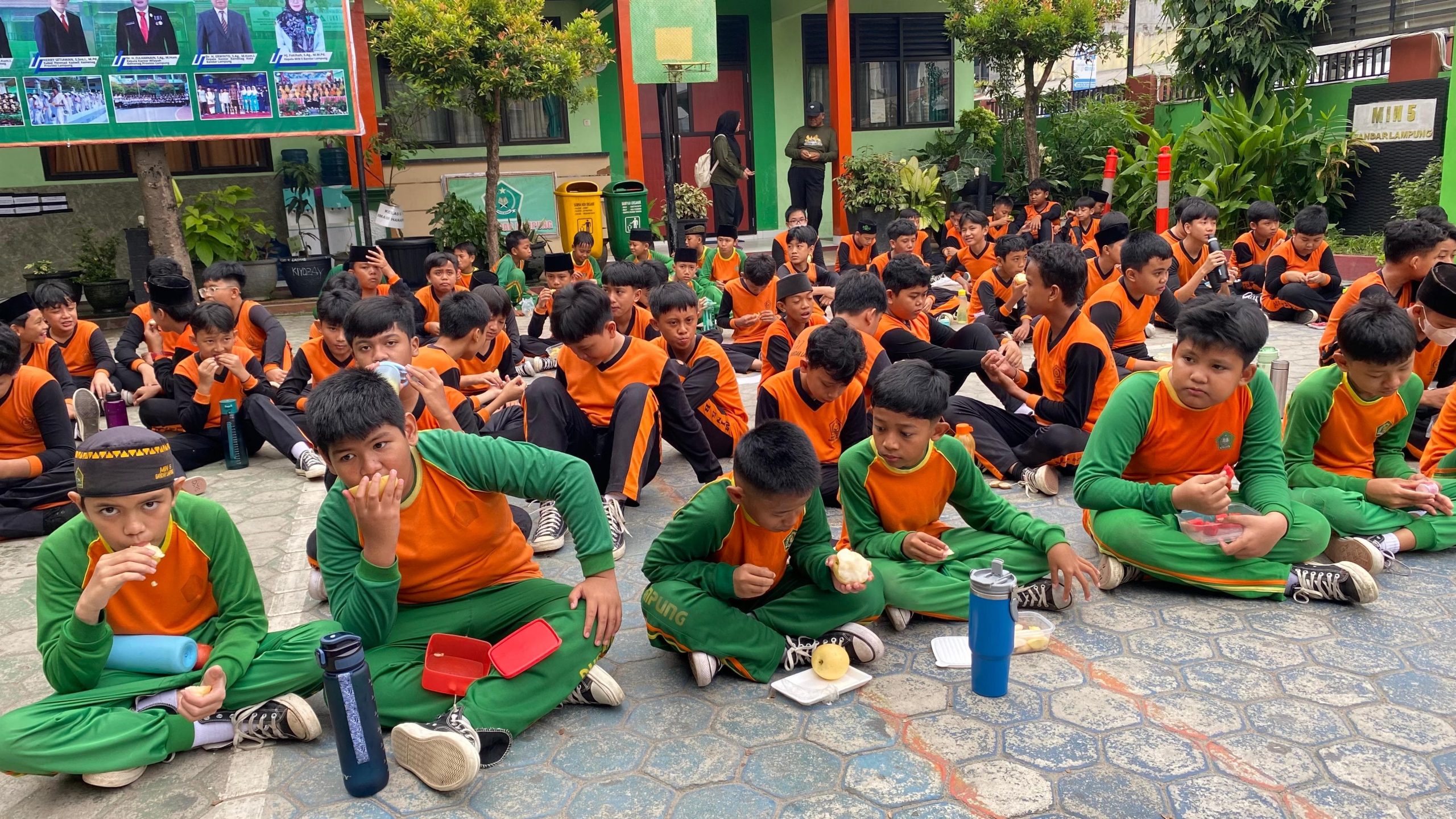 Usai melaksanakan senam, kegiatan dilanjutkan dengan makan buah bersama di halaman madrasah. Para siswa duduk berkelompok sambil menikmati bekal buah yang telah dibawa. Suasana terlihat santai namun tetap tertib, mencerminkan kebiasaan positif dalam menjaga pola makan sehat sejak usia dini.
