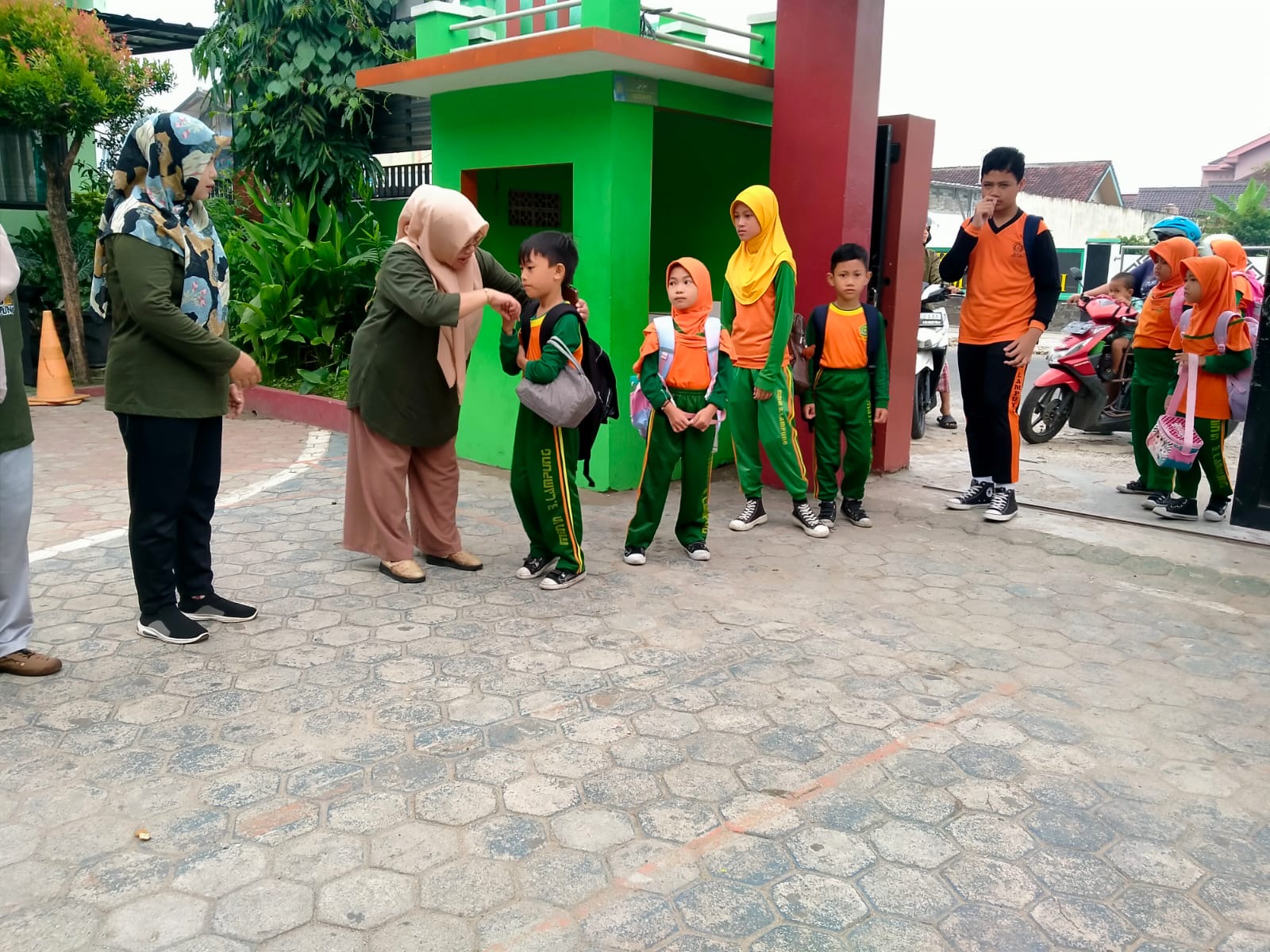 Guru menyambut kedatangan siswa di gerbang madrasah sebagai bagian dari pembiasaan disiplin dan kedekatan dengan peserta didik.