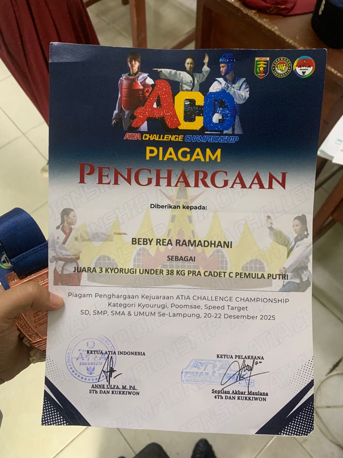 Piagam penghargaan ATIA Challenge Championship yang diraih siswi kelas V MIN 2 Bandar Lampung pada kejuaraan tingkat Se-Lampung.