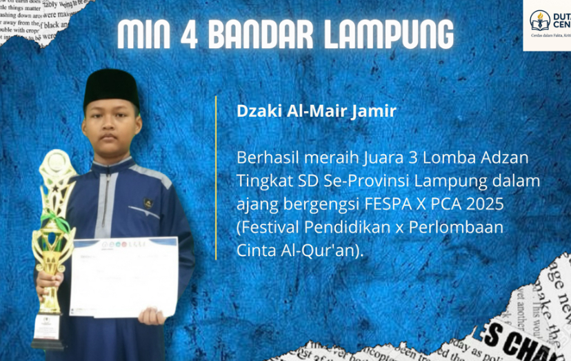 dutacendikia.id, Bandar Lampung – Sorak gembira bercampur haru mengiringi kabar prestasi yang diraih oleh siswa MIN 4 Bandar Lampung. Ananda Dzaki Al-Mair Jamir, salah satu peserta didik yang dikenal tekun dan bersemangat dalam kegiatan keagamaan, berhasil meraih Juara 3 Lomba Adzan Tingkat SD se-Provinsi Lampung dalam ajang Festival Pendidikan dan Perlombaan Cinta Al-Qur’an (FESPA X PCA 2025) yang digelar oleh Himpunan Mahasiswa Jurusan Pendidikan Agama Islam (HIMAJIP) FKIP Universitas Lampung, di Kampus B Metro.
