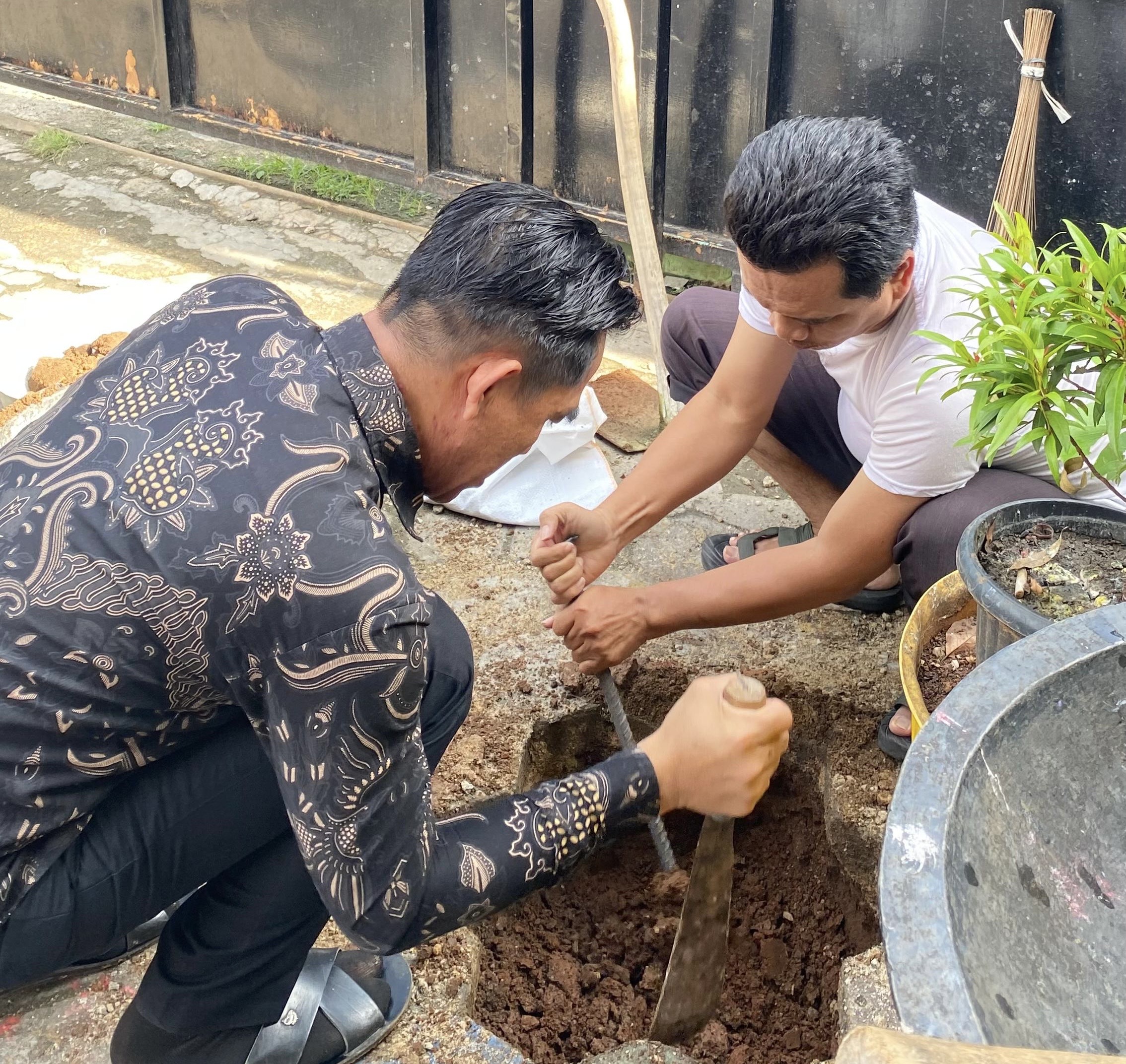 Ahmad Firdaus, S.Pd.I., M.Pd. menyiapkan lubang tanam di halaman madrasah sebelum proses penanaman dilakukan.