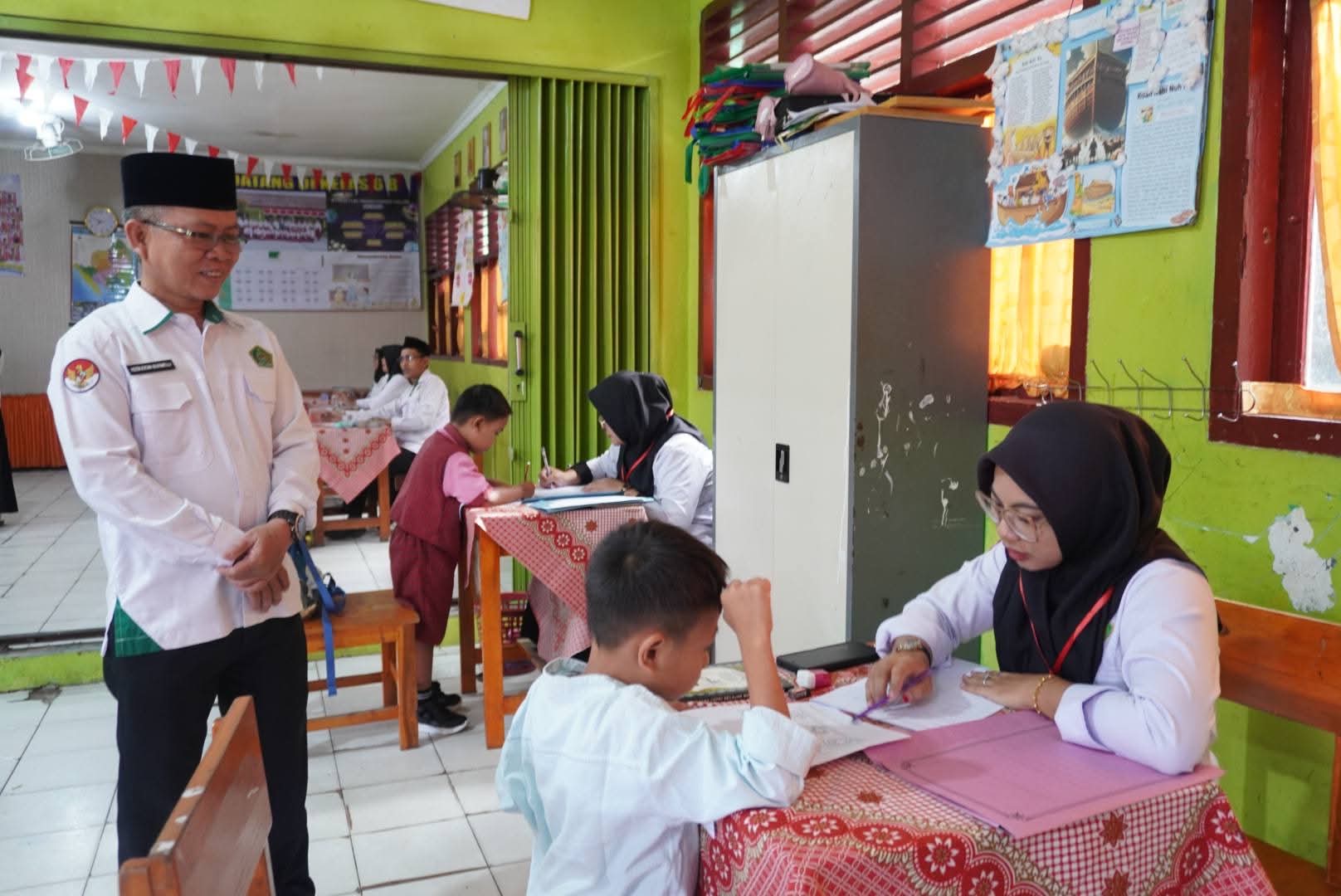 Kepala madrasah memantau langsung pelaksanaan tes observasi calon siswa di ruang kelas MIN 1 Bandar Lampung.