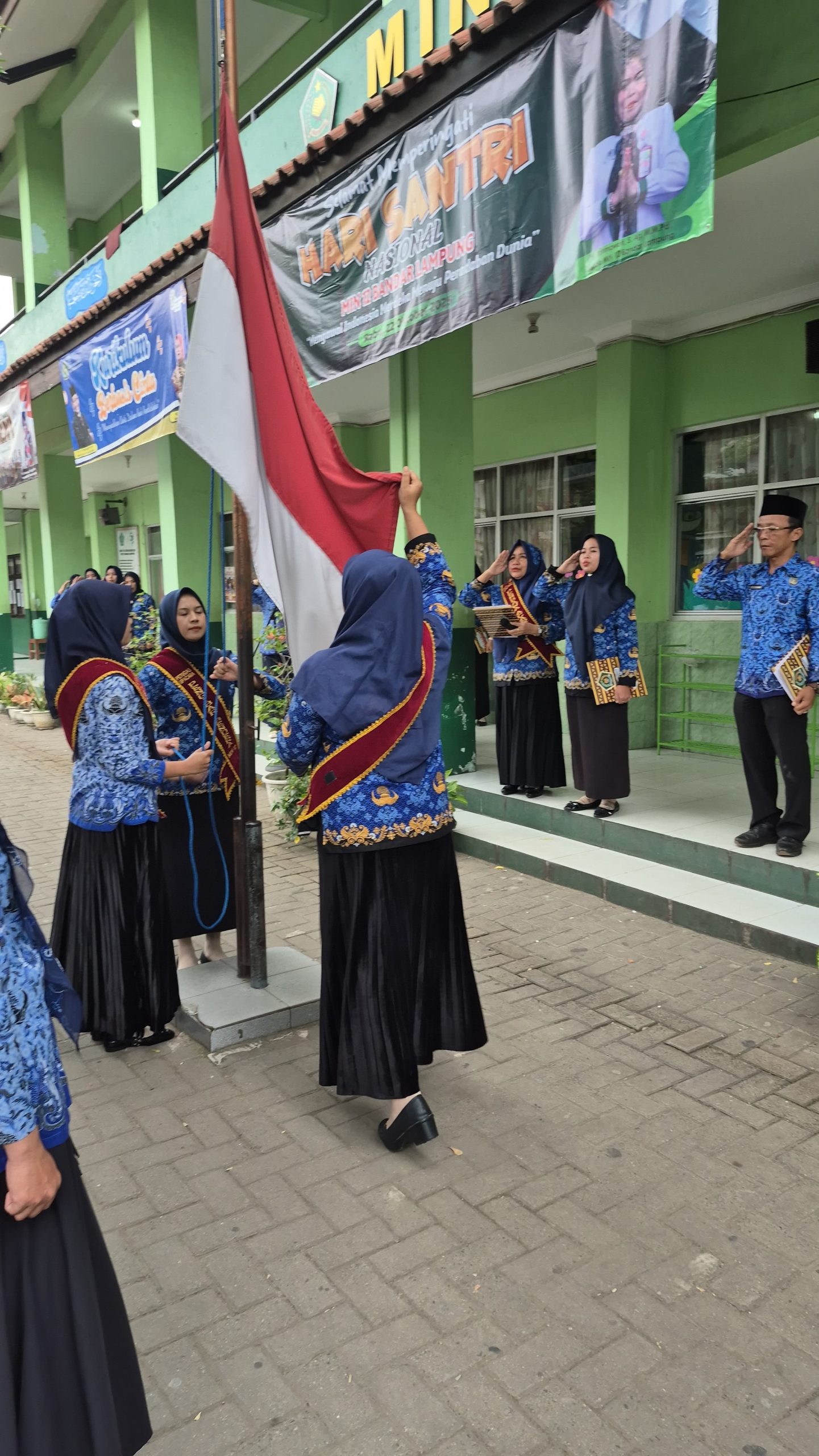 Bendera Merah Putih berkibar dengan khidmat di halaman MIN 12 Bandar Lampung diiringi penghormatan dari para guru dan siswa saat lagu Indonesia Raya dinyanyikan bersama.