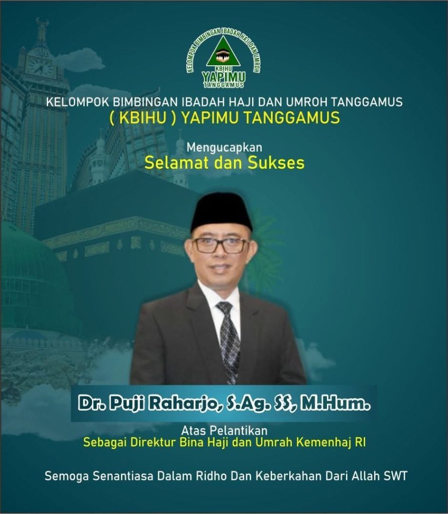 dutacendikia.id, Tanggamus – Kelompok Bimbingan Ibadah Haji dan Umroh (KBIHU) YAPIMU Tanggamus memberikan ucapan selamat dan sukses atas pelantikan Dr. Puji Raharjo, S.Ag., SS., M.Hum. sebagai Direktur Bina Haji dan Umrah Kementerian Haji Republik Indonesia. Ucapan tersebut disampaikan seiring rasa bangga atas penunjukan salah satu anggota keluarga besar IKAFURI UIN Lampung untuk menduduki posisi strategis dalam pembinaan penyelenggaraan ibadah haji dan umrah nasional.