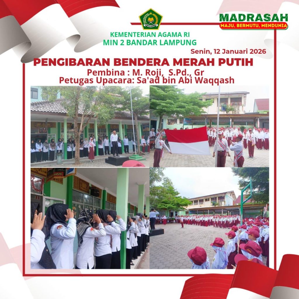 dutacendikia.id, Bandar Lampung – Budaya disiplin kembali diteguhkan di lingkungan MIN 2 Bandar Lampung melalui pelaksanaan upacara pengibaran Bendera Merah Putih, Senin (12/1/2026). Sejak pagi hari, suasana madrasah telah dipenuhi semangat kebersamaan dan ketertiban yang menjadi ciri khas kegiatan rutin awal pekan tersebut.