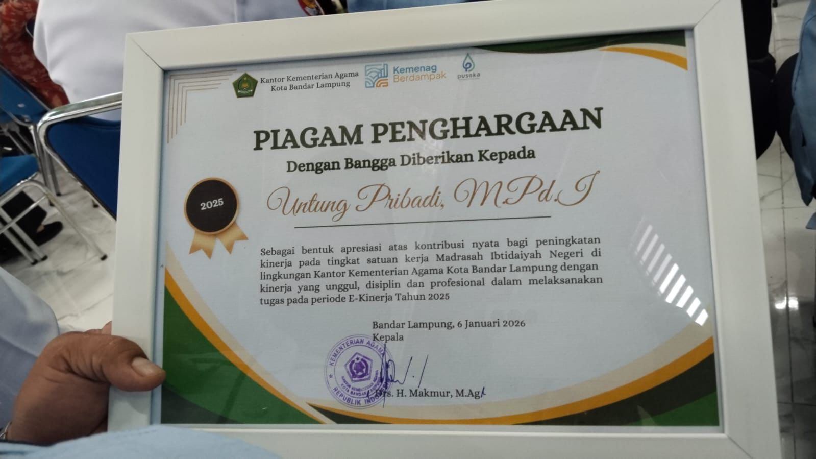 Kepala MIN 2 Bandar Lampung, Untung Pribadi, M.Pd.I., menerima piagam penghargaan kinerja E-Kinerja Tahun 2025.