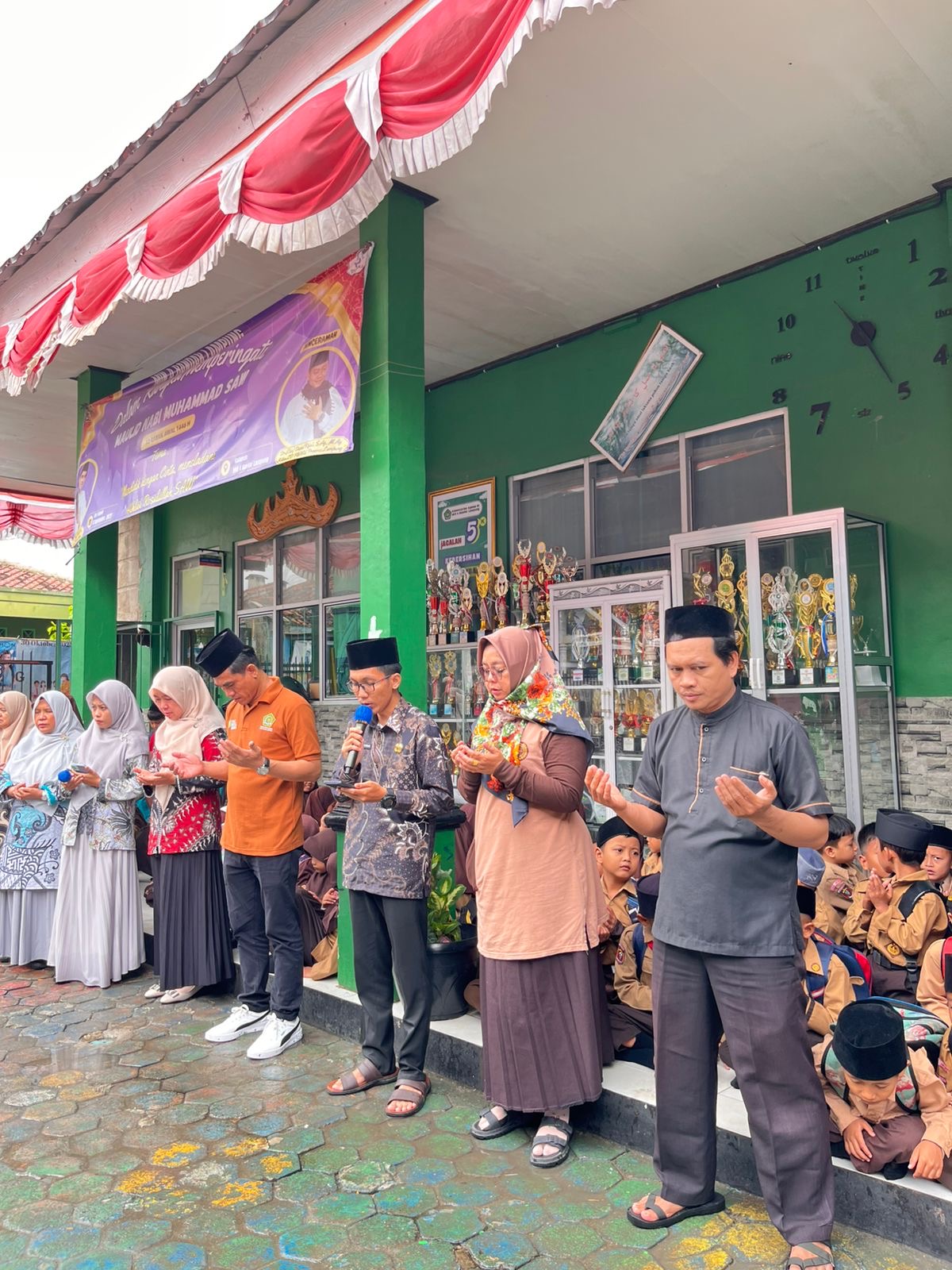 Peserta didik tampak mengikuti rangkaian kegiatan dengan tertib dan khidmat. Lingkungan madrasah menjadi latar kegiatan, dengan deretan piala prestasi yang terpajang di depan ruang kelas, menegaskan keterkaitan antara lingkungan belajar yang bersih dan budaya prestasi.