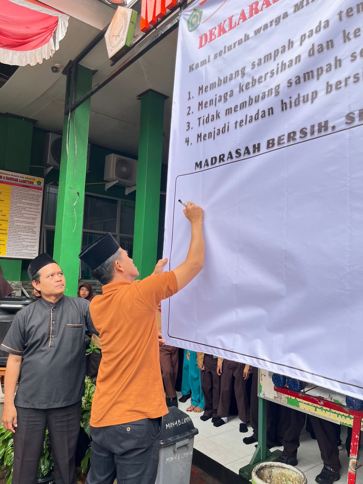 Kepala MIN 4 Bandar Lampung Ahmad Firdaus, S.Pd.I., M.Pd. menandatangani deklarasi Madrasah Bersih di hadapan warga madrasah.