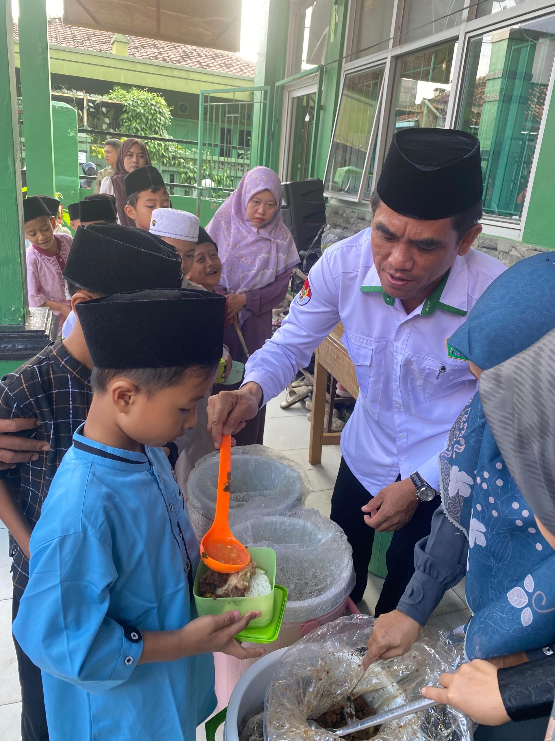 Anak-anak tampak ceria menyantap hidangan dengan teman sebaya, sementara guru dan staf mendampingi penuh kehangatan