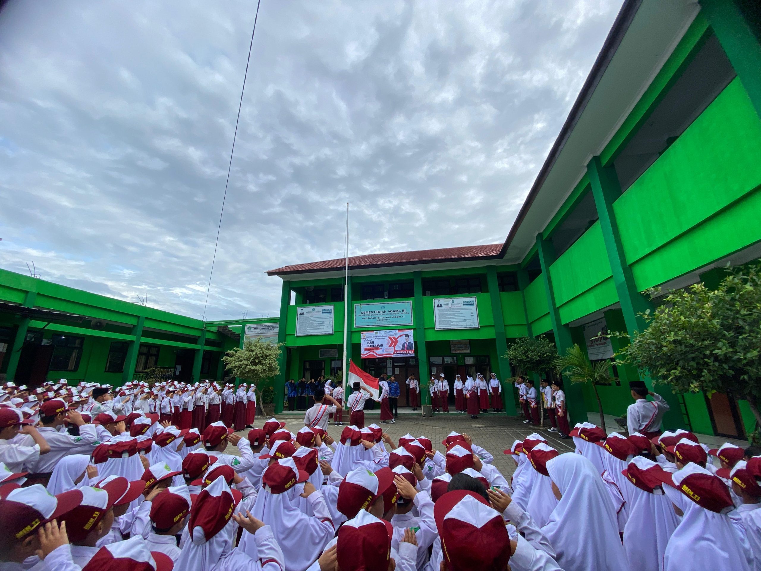 Siswa-siswi MIN 11 Bandar Lampung mengikuti upacara Hari Pahlawan dengan penuh semangat di halaman madrasah.