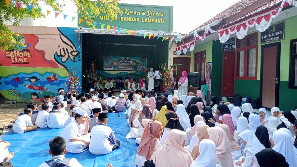 Siswa-siswi MIN 12 Bandar Lampung mengikuti peringatan Maulid Nabi Muhammad SAW dengan penuh khidmat di halaman madrasah.
