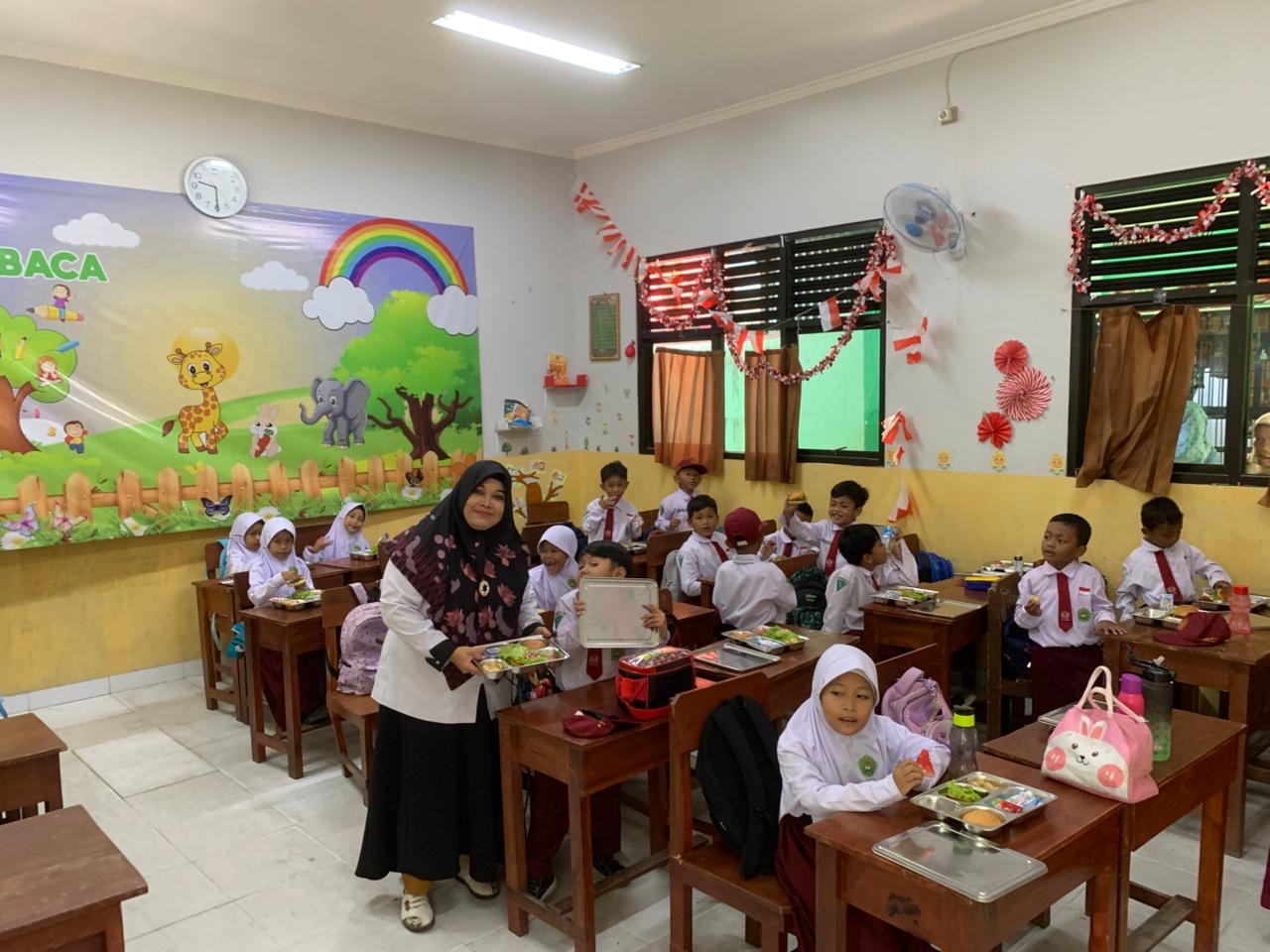 Pembagian makanan bergizi di MIN 2 Bandar Lampung.