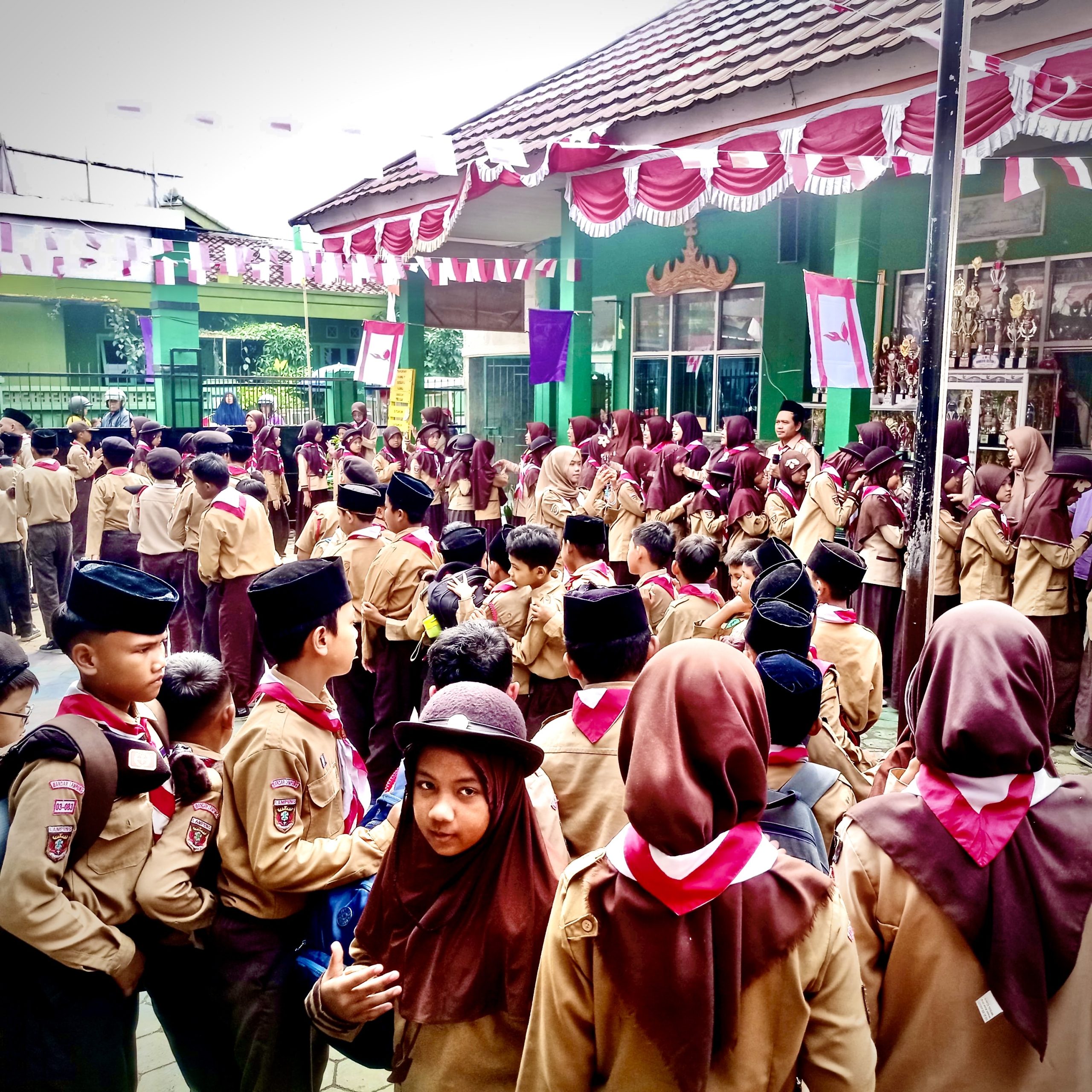 Peserta perkemahan MIN 4 Bandar Lampung berkumpul di halaman madrasah sebelum mengikuti rangkaian kegiatan Hari Pramuka.