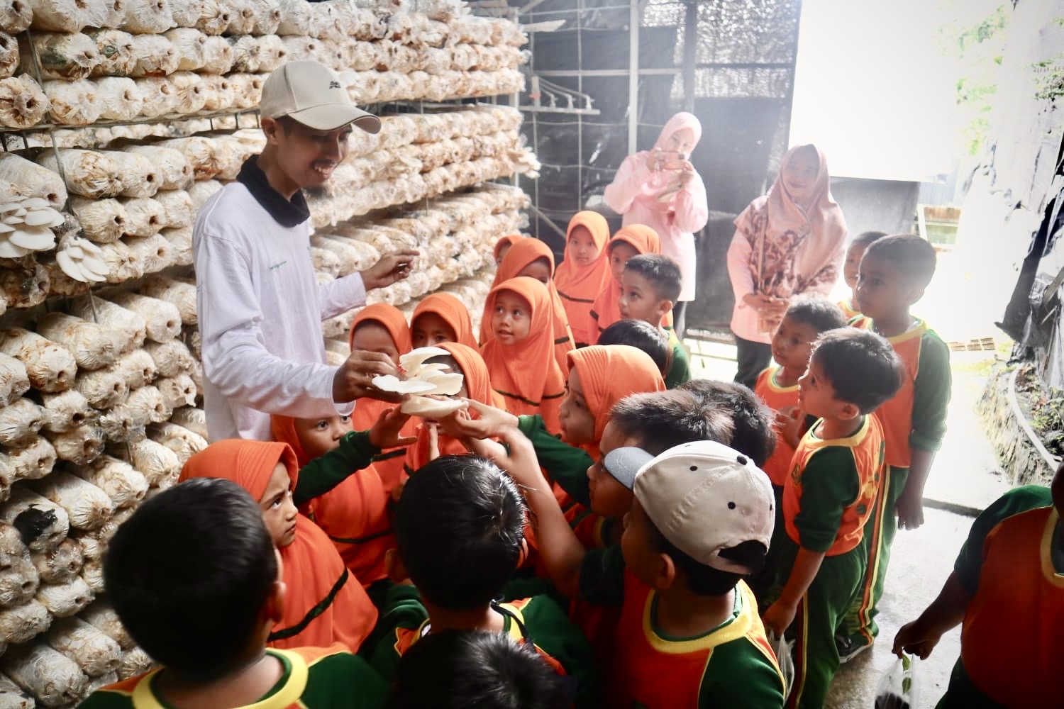 Dalam salah satu sesi, siswa terlihat begitu takjub saat diperkenalkan dengan jamur tiram yang ditanam secara modern di rak-rak khusus. Dengan penuh rasa ingin tahu, mereka berinteraksi langsung dengan pemandu yang menjelaskan proses pembibitan hingga panen. Tak berhenti di situ, para siswa juga diberikan kesempatan menanam bibit cabai sendiri sebagai bentuk pembelajaran praktik sekaligus penanaman nilai tanggung jawab menjaga tanaman.