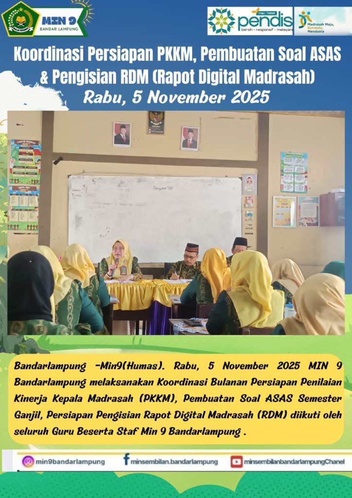 Melalui kegiatan koordinasi ini, MIN 9 Bandar Lampung menegaskan komitmennya dalam menjaga mutu tata kelola pendidikan sekaligus memperkuat budaya kerja berbasis profesionalisme dan tanggung jawab. Semangat kebersamaan antara guru dan staf menjadi cerminan nyata upaya madrasah dalam mewujudkan layanan pendidikan yang unggul, berkarakter, dan berdaya saing. (Septiano/Humas)