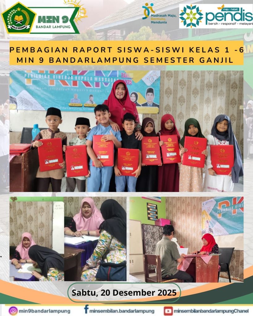 dutacendikia.id, Bandar Lampung – MIN 9 Bandar Lampung melaksanakan pembagian rapor semester ganjil Tahun Ajaran 2025/2026 bagi seluruh siswa kelas I hingga VI pada Sabtu, 20 Desember 2025. Kegiatan ini menjadi penutup rangkaian proses pembelajaran semester ganjil sekaligus momentum evaluasi perkembangan akademik dan karakter peserta didik.