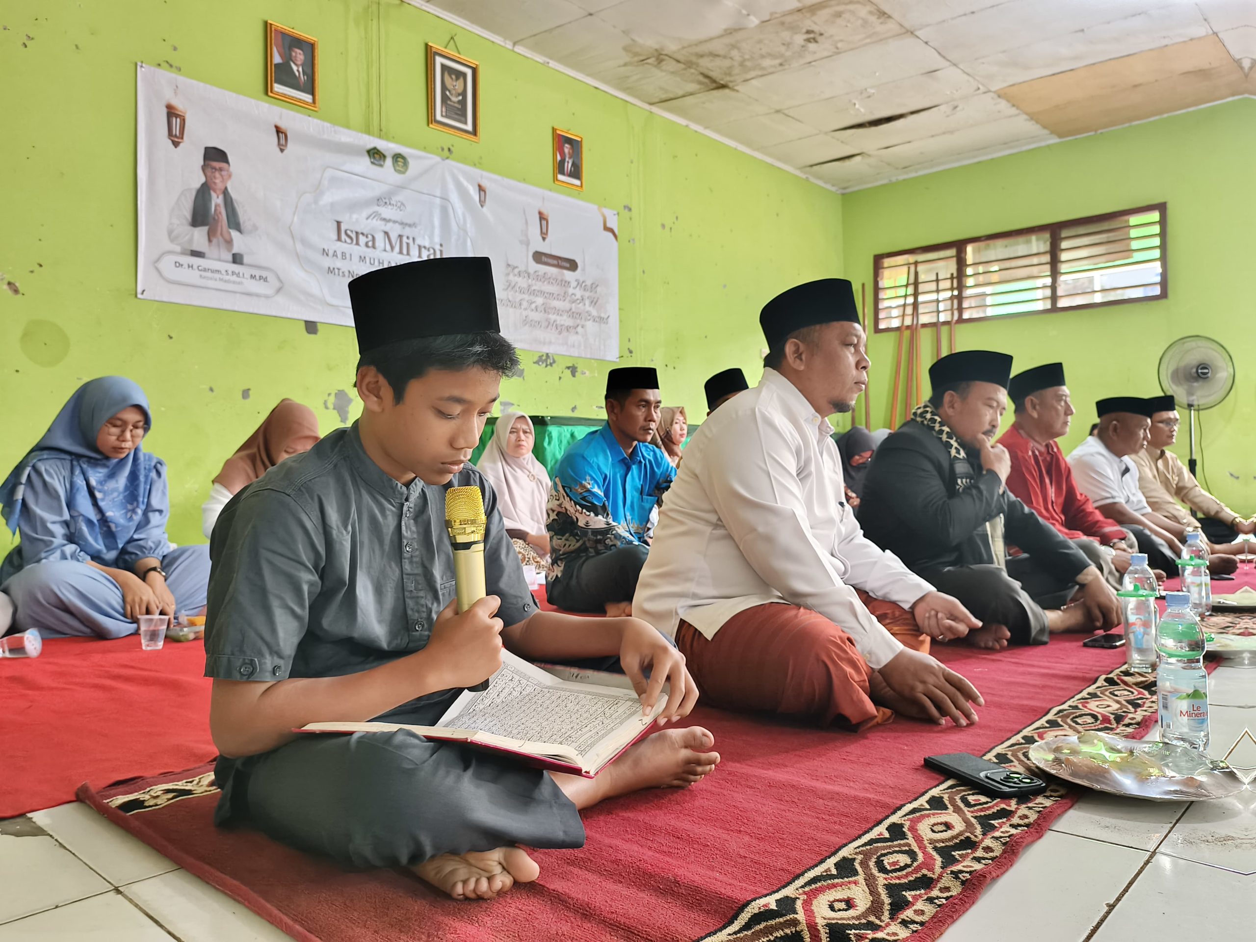 Sejak pagi, aula madrasah tampak dipenuhi peserta yang duduk tertib mengikuti rangkaian acara. Nuansa religius terasa kuat dengan balutan dekorasi sederhana dan kebersamaan seluruh warga madrasah dalam memperingati peristiwa agung perjalanan spiritual Rasulullah SAW sebagai tonggak pensyariatan salat lima waktu.