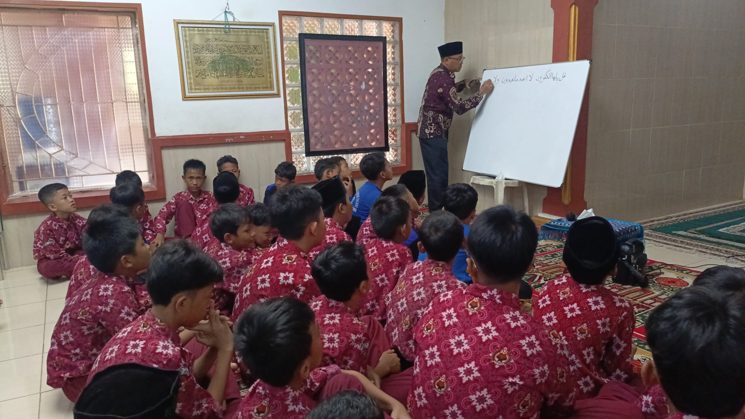 Guru-guru pendamping turut mengamati proses pembelajaran dari barisan belakang, memastikan seluruh peserta mengikuti arahan dengan tertib. Kehadiran siswa putri yang duduk berjajar rapi di sisi kanan musala semakin memperlihatkan suasana pembelajaran yang penuh kedisiplinan dan kekhidmatan.