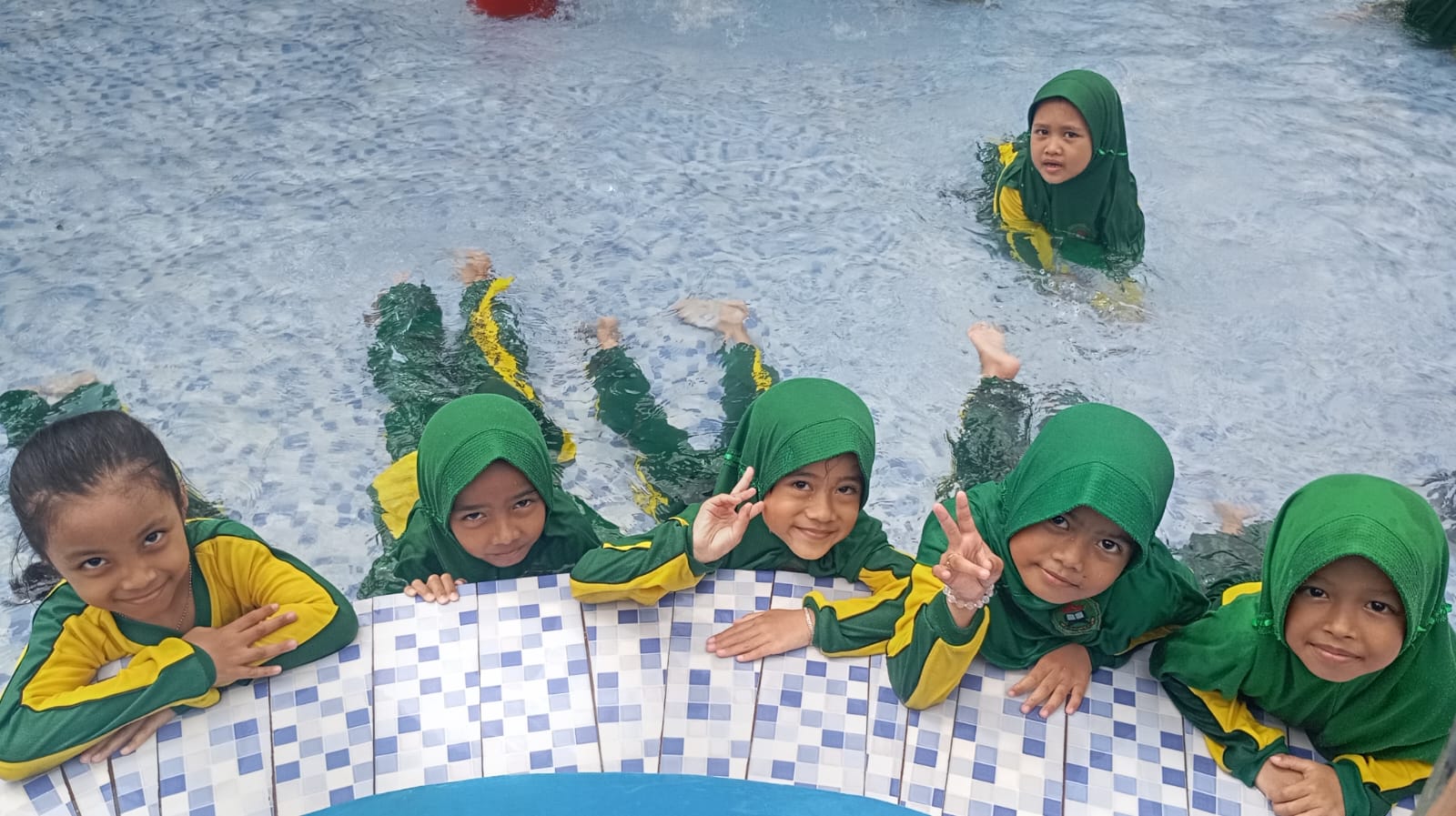 Keseruan berlanjut saat kelompok berikutnya memasuki area kolam. Dengan pengawasan ketat guru dan petugas kolam, para siswa menikmati sesi renang sambil bermain air dengan aman. Bagi beberapa anak, ini menjadi pengalaman pertama mencoba renang dalam format pembelajaran terbimbing. Tawa dan ekspresi gembira terdengar hampir tanpa henti.
