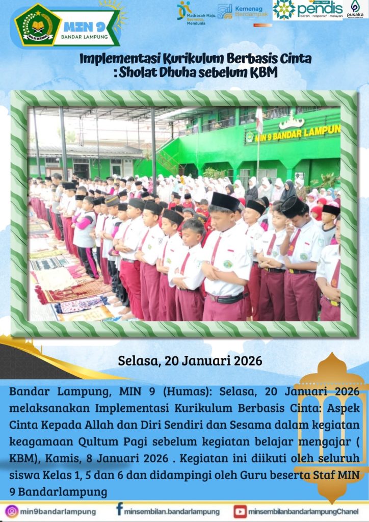 dutacendikia.id, Bandar Lampung -Pelaksanaan Sholat Dhuha berjamaah mengawali aktivitas belajar siswa MIN 9 Bandar Lampung pada Selasa pagi, 20 Januari 2026. Kegiatan ini menjadi bagian dari implementasi Kurikulum Berbasis Cinta, khususnya pada aspek cinta kepada Allah dan penguatan nilai-nilai keagamaan di lingkungan madrasah.