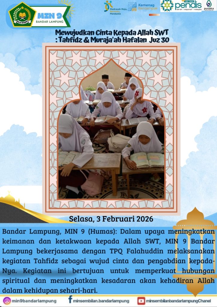 dutacendikia.id, Bandar Lampung – Upaya menanamkan kecintaan terhadap Al-Qur’an terus diperkuat oleh MIN 9 Bandar Lampung melalui kegiatan Tahfidz dan Muraja’ah Hafalan Juz 30 yang dilaksanakan pada Selasa, 3 Februari 2026. Kegiatan ini menjadi bagian dari ikhtiar madrasah dalam membangun keimanan dan ketakwaan peserta didik sejak usia dasar.