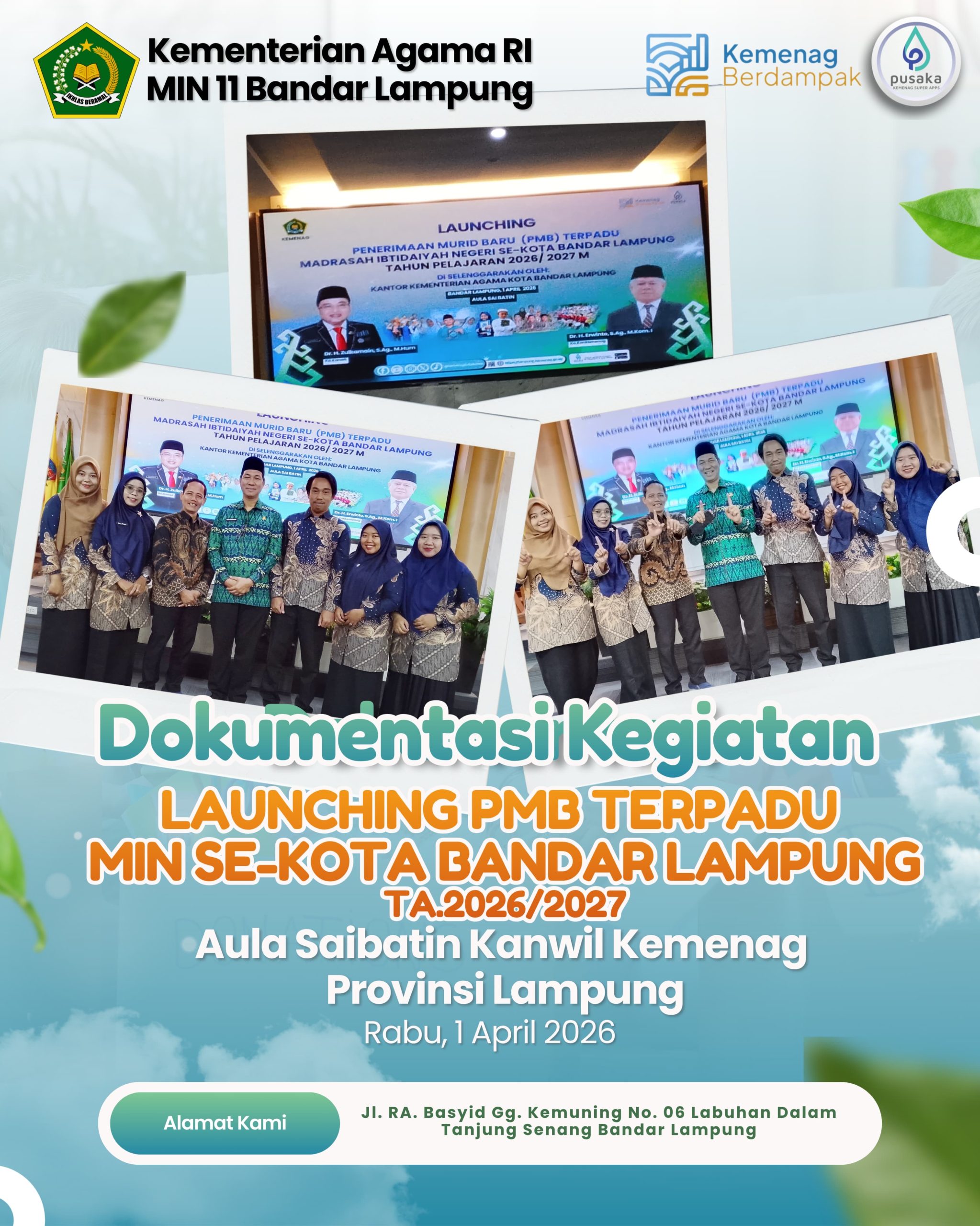 dutacendikia.id, Bandar Lampung – Madrasah Ibtidaiyah Negeri (MIN) 11 Bandar Lampung turut ambil bagian dalam kegiatan launching Penerimaan Murid Baru (PMB) terpadu MIN se-Kota Bandar Lampung Tahun Ajaran 2026/2027 yang digelar di Aula Saibatin, Kantor Wilayah Kementerian Agama Provinsi Lampung, Rabu (1/4/2026).