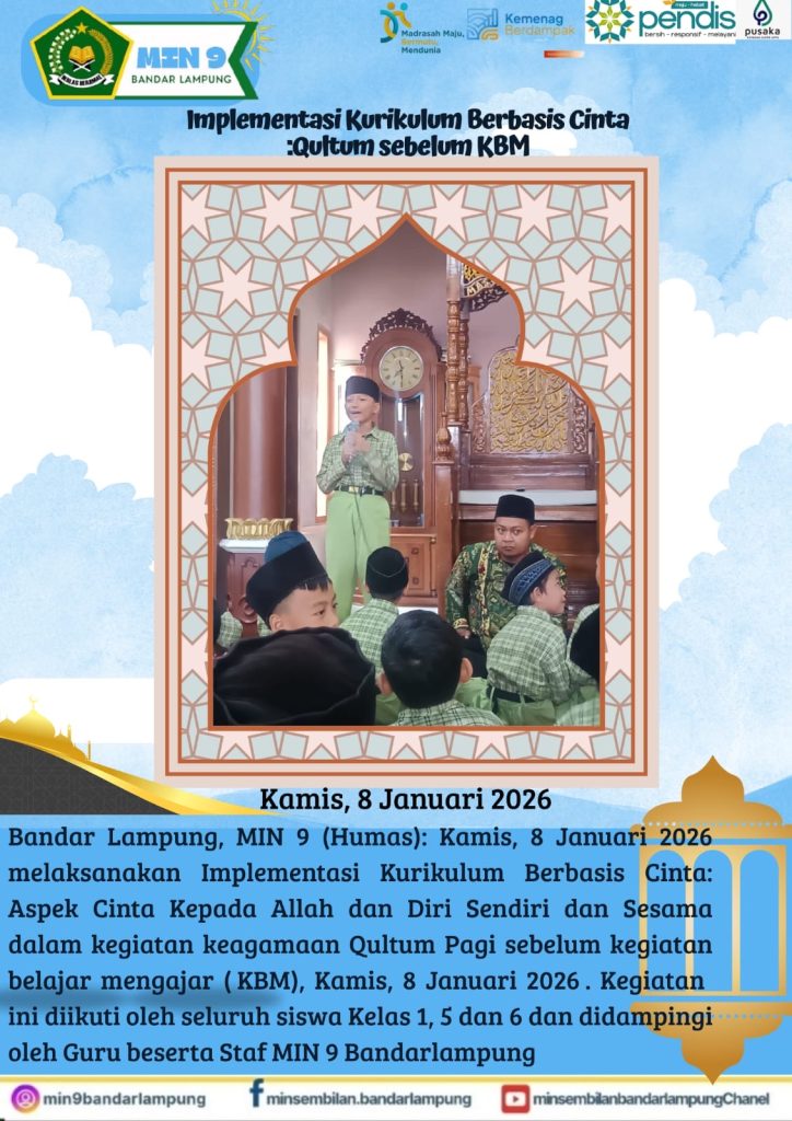 dutacendikia.id, Bandar Lampung – Madrasah Ibtidaiyah Negeri (MIN) 9 Bandar Lampung melaksanakan kegiatan qultum pagi sebagai bagian dari implementasi Kurikulum Berbasis Cinta, Kamis (8/1/2026). Kegiatan ini berlangsung di Masjid Falahuddin, yang berada di sebelah MIN 9 Bandar Lampung, sebelum dimulainya kegiatan belajar mengajar (KBM).