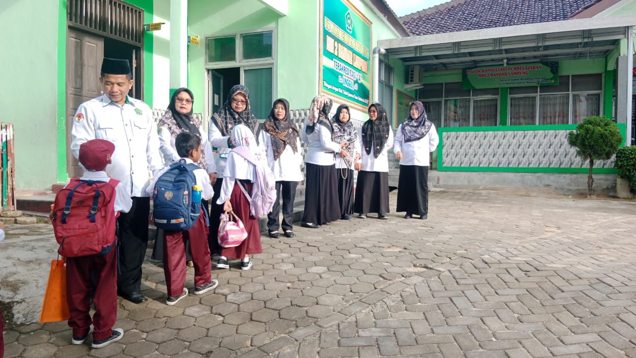 Guru dan kepala madrasah menyambut kedatangan siswa di pagi hari sebelum kegiatan belajar dimulai.