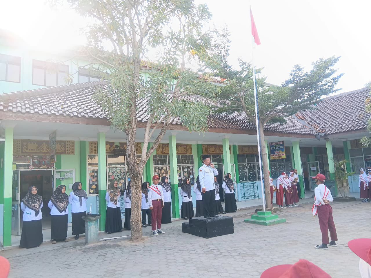 Di sisi lain halaman, para guru ikut mengawasi jalannya kegiatan sambil memastikan setiap siswa mengikuti rangkaian upacara dengan benar. Barisan siswa yang tertib dan fokus menunjukkan adanya pembiasaan baik yang terus ditanamkan setiap pekan.